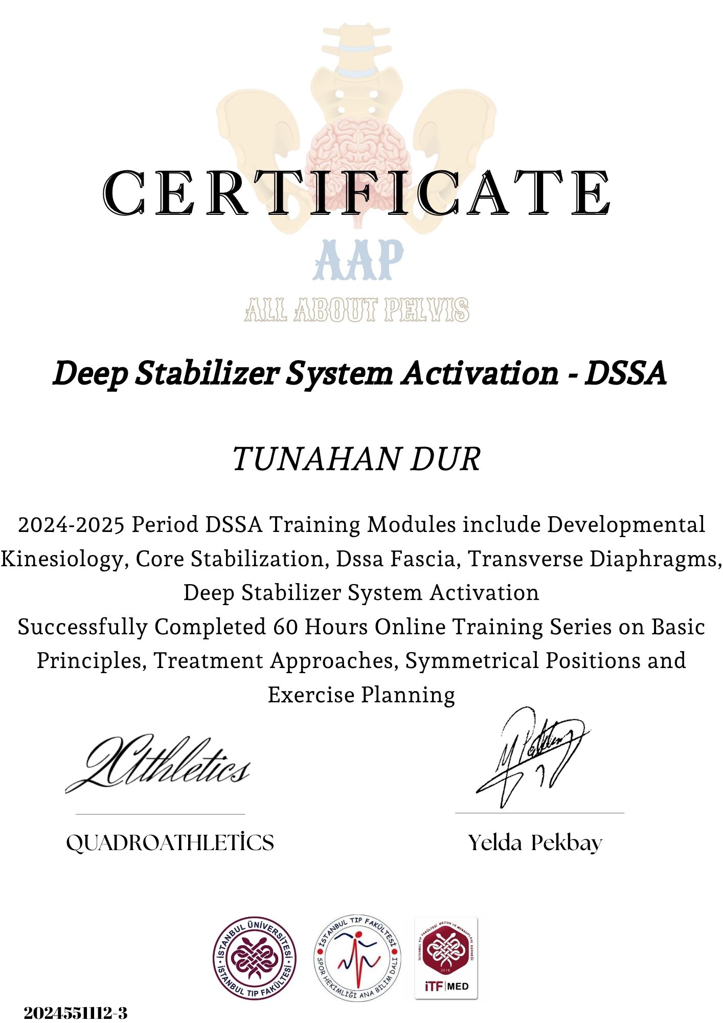Pelvik taban eğitiminin temeli DSSA eğitimi içinde sunulmaktadır. Bu sebeple Pelvik Taban eğitiminin ön koşulu DSSA teorik eğitimini tamamlamış olmaktır.